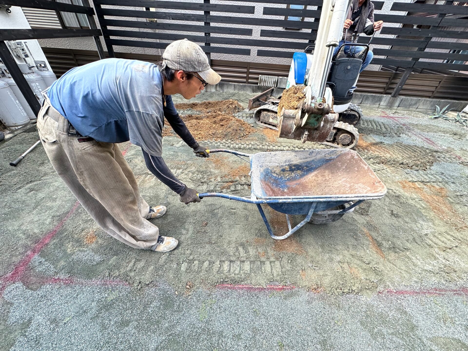 狭小地での作業という事もあり、掘削残土を一輪車で運搬します。