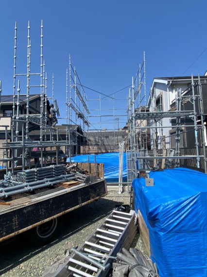 豊橋市『宮下町の家』では、先行外部足場の設置が行われました。