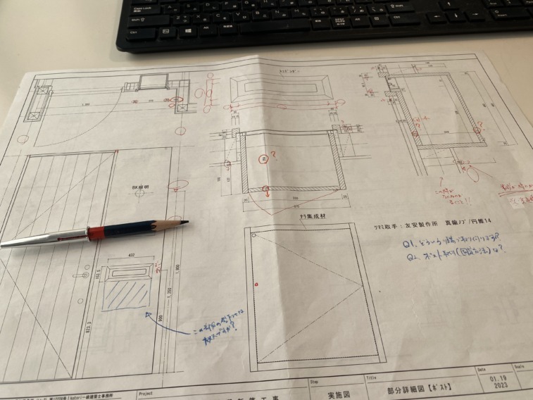 今回も、とある物件のポスト廻りの施工図をスタッフに書いてもらい、