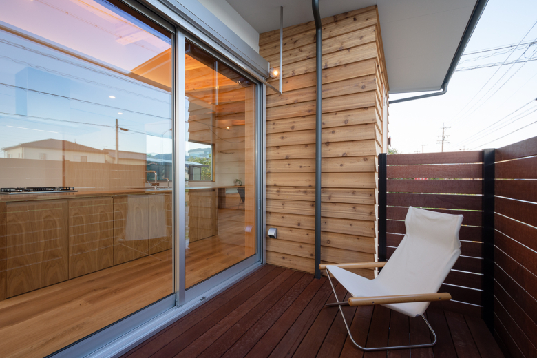 ウッドデッキで、いま流行りのポップアップテントを出して、