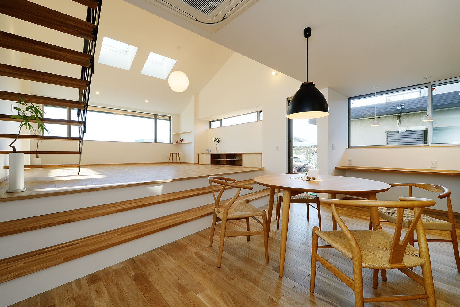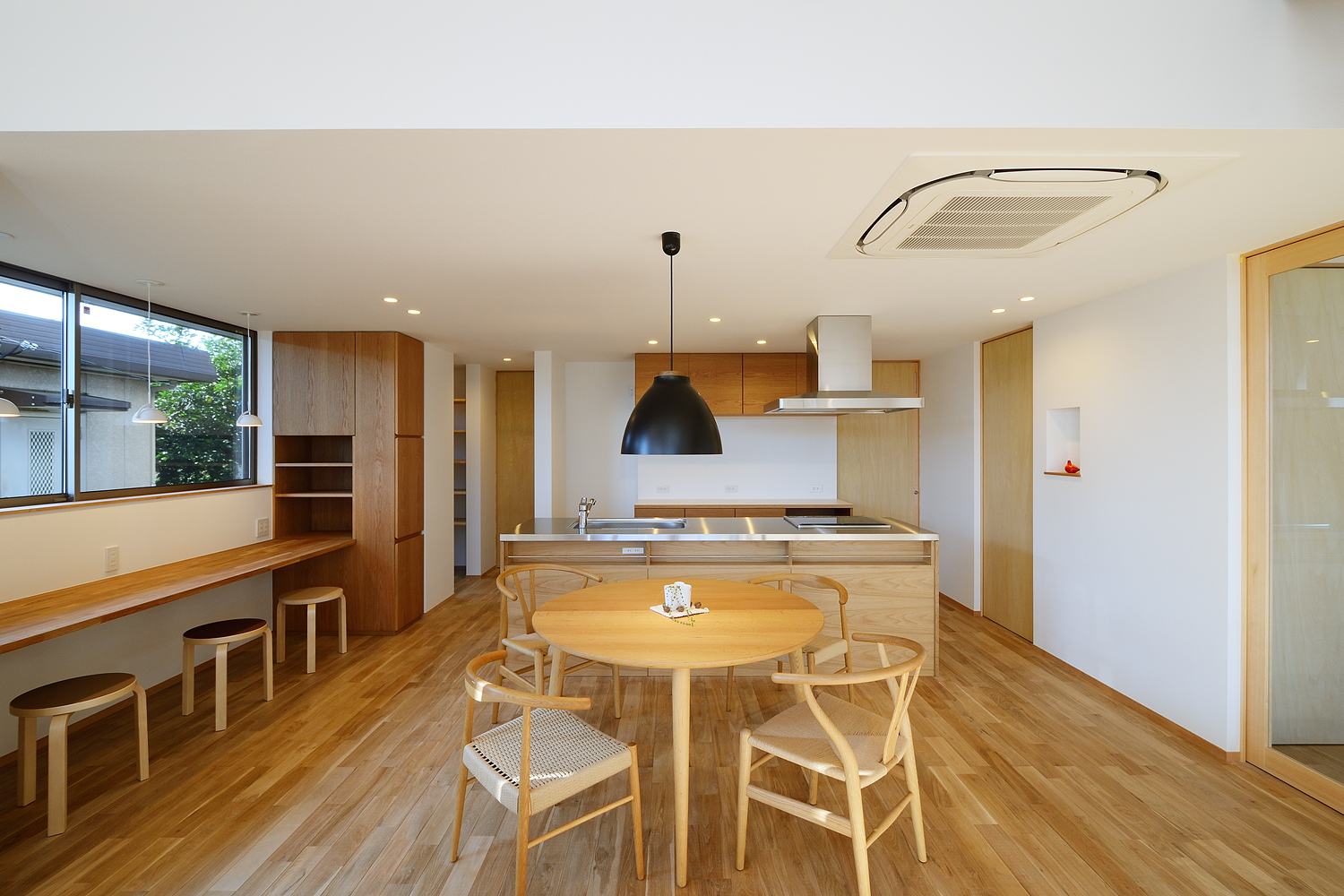 低い方のダイニング・キッチンには、製作のアイランドキッチンと丸テーブルを配し、家族が自然に集まる中心空間としました。