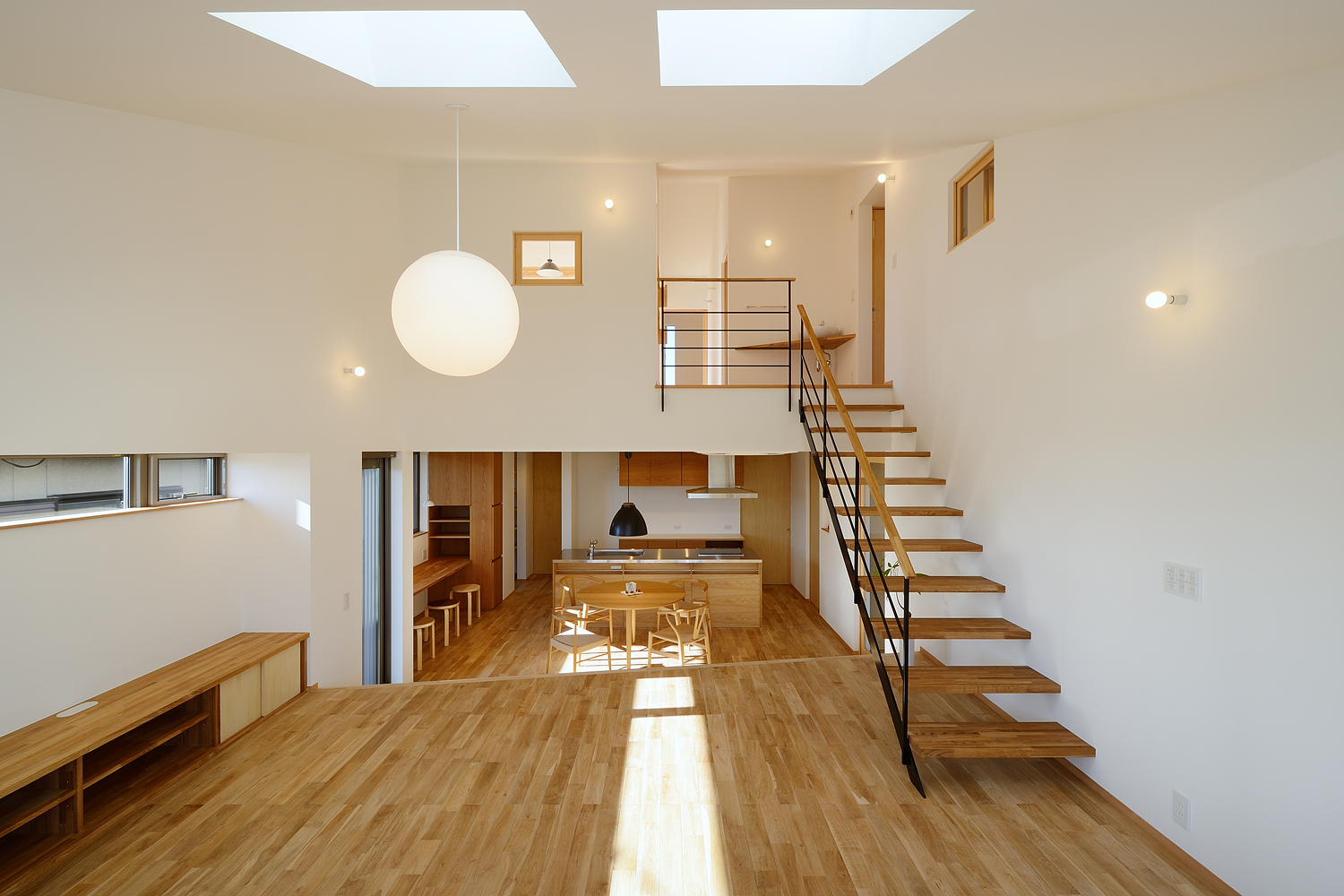 南側の大きな横長窓、トップライト、吹抜けにより、光と風が通り抜ける開放的な空間です。