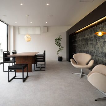 まず平屋特有の重厚感を強調させるように玄関の軒を深くし、雨の日は車から濡れず玄関へアクセスできます。玄関からは一般動線と家事動線とに分け、家事動線は玄関から土間収納を通りパントリー(食品庫)そしてキッチンへと直接行けます。一般動線は玄関ホールにベンチを設け、座って靴も履け、玄関で井戸端会議もできる空間になっています。一角に手洗い場も設け、帰って来てすぐ手洗いうがいができるようにしました。そこを通り抜け、ガラス戸を開けると解放感ある大きなLDKが広がります。LDKは南北に大きな窓を設けることで視線が外まで通り抜け、室内にいながら周囲の景観との一体感を得られます。和室は客間、子供の遊び場、洗濯物を畳む場所として、多用途に使え、玄関から近く、かつキッチンから目の届きやすい配置としました。LDKから各居室に行くための廊下にはワークスペースが設けられ、宿題をしながら中庭を望むことができます。ワークスペースを通ると南側に子供室、北側に寝室があります。どの部屋にいても景観が望め光や風が通るよう配置を工夫しました。