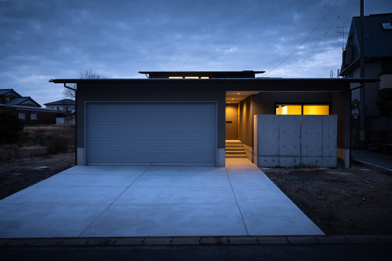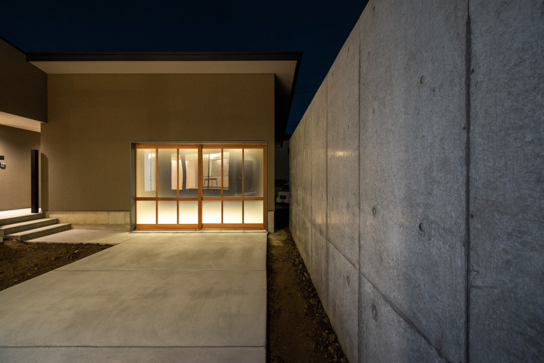 単調になりがちな平屋部分のファサードには、玄関アプローチを長く潜り込ませることで奥行感を演出し