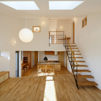 LDKから建具で仕切られた階段を上ると、大きなトップライトから柔らかな光が降り注ぐホールに出ます。
